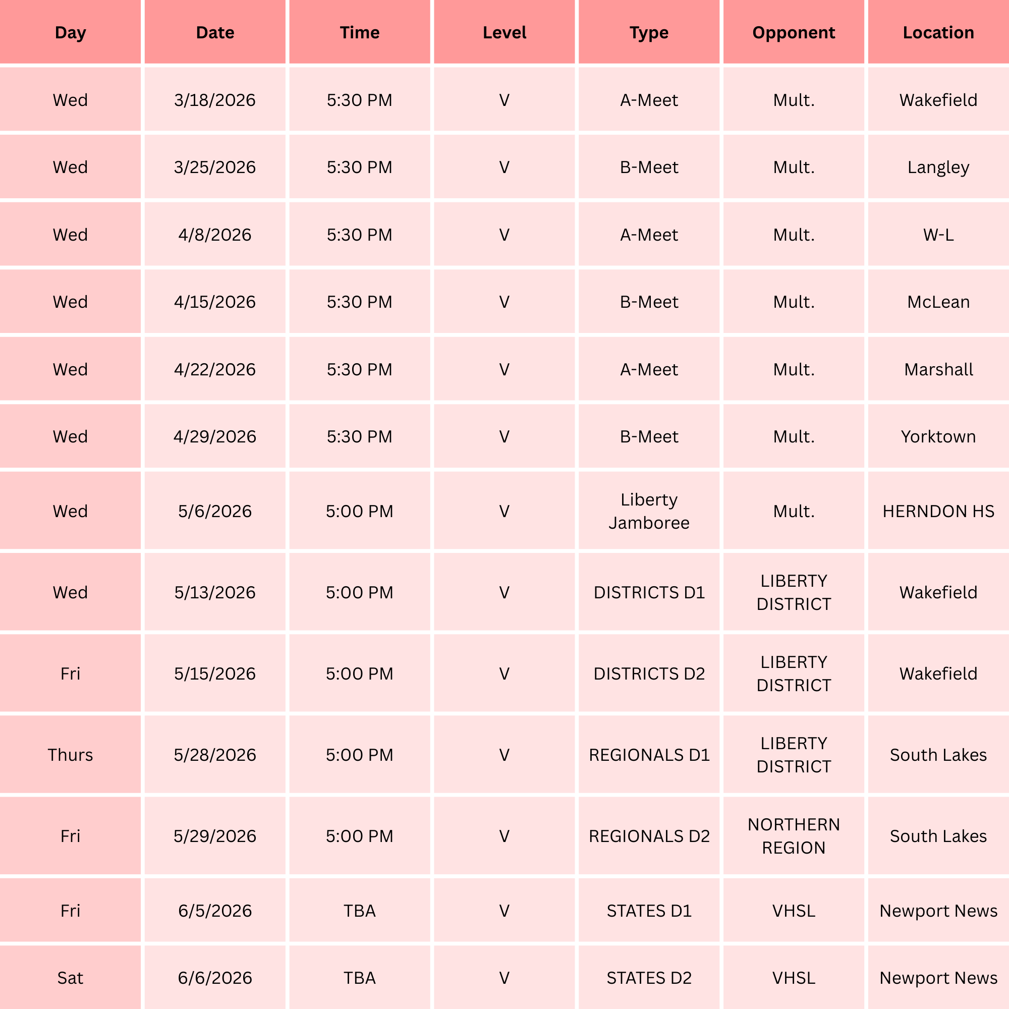 2026 Spring Sports Schedules
